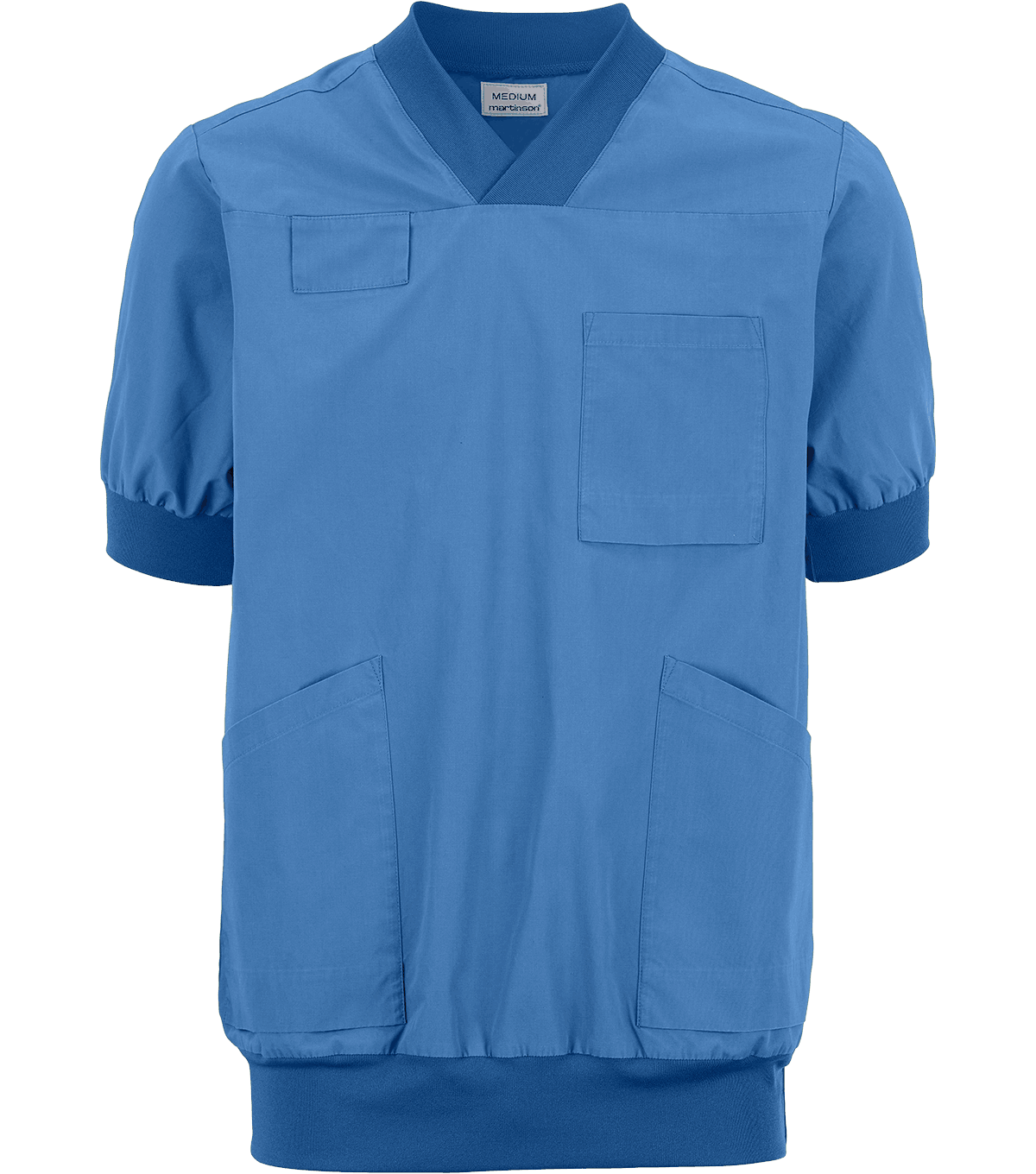 Operationsblus med V-hals och mudd i hals, ärm och midja. Blusen har bröstficka på vänster sida och namnskyltshållare på höger sida. Två större framfickor för förvaring av tillbehör. Plagget är anpassat för höga tvättemperaturer. Längd mitt bak 80 cm i storlek M. Materialet är certifierad enligt EN13795:2011 +A1:2013.