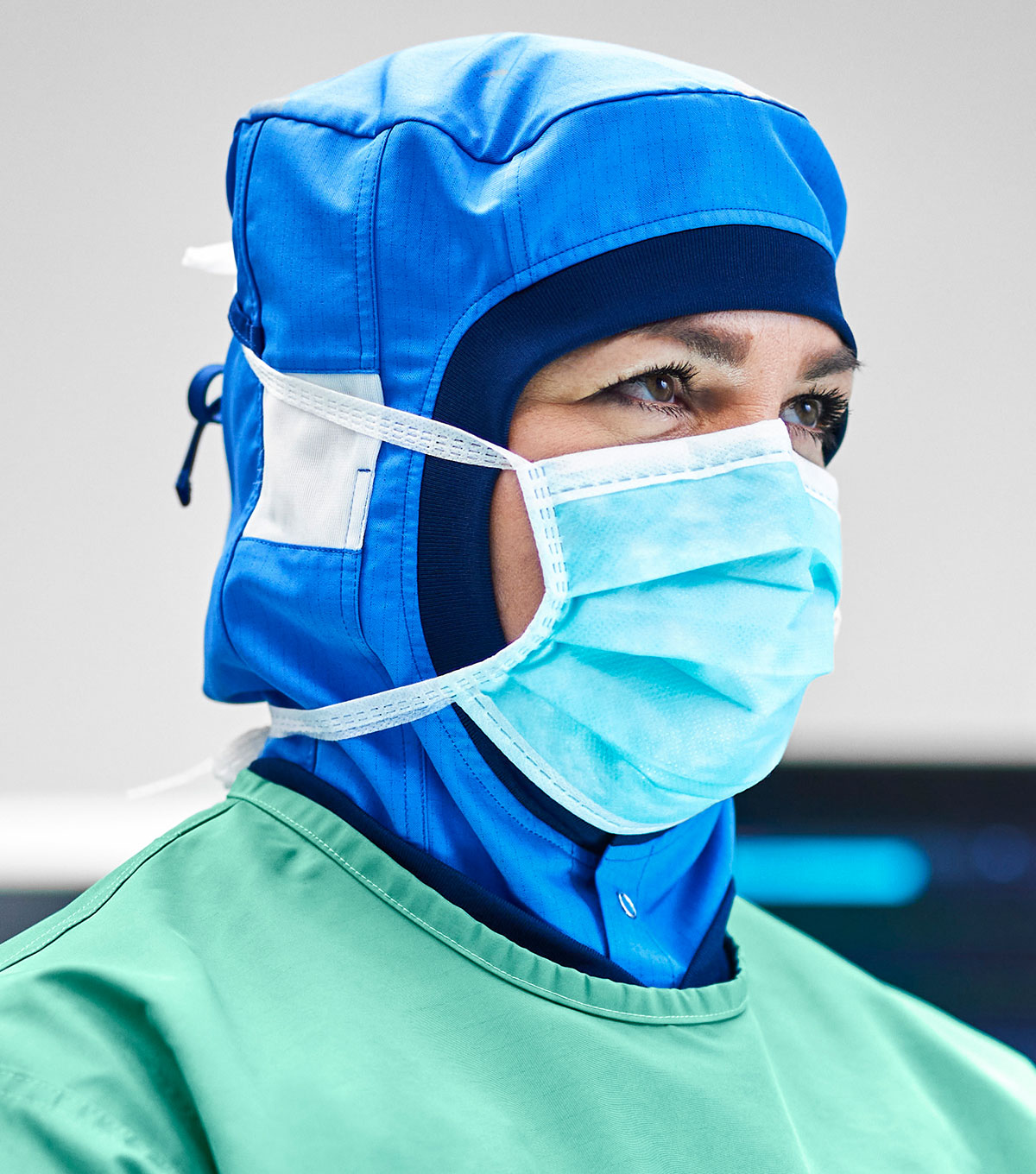 Operationshuva i microfiber med tätslutande mudd kring ansiktet. Huvan knäpps med tryckknappar och har knytband bak för att optimal passform. Vid öronen finns ett nät för ökad hörbarhet samt öppning för glasögonskalmar.
